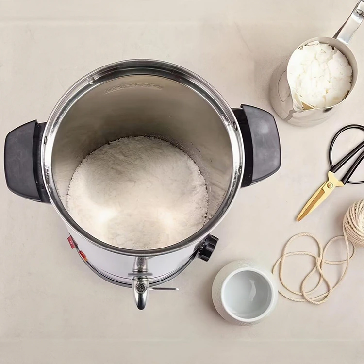 Nanjing FNAT ist eine Fabrik mit Ursprung in China, die sich auf den Bereich Kerzenrohstoffe spezialisiert hat. Unsere professionellen Wachsschmelzgeräte sind ausschließlich zum Wachsschmelzen konzipiert und aus lebensmittelechtem Edelstahl 304 mit mehreren Kapazitäten (5 l, 8 l, 10 l, 12 l, 15 l, 25 l, 35 l, 45 l usw.) gefertigt. Es verfügt über internationale Steckeroptionen, einen nicht verstopfenden und leicht zu reinigenden Wachshahn, Temperaturregelung, doppelschichtige Isolierung und eine dreidimensionale Heizung im gesamten Gehäuse für schnelle Geschwindigkeit und hohe thermische Effizienz. Stabil in der Qualität, vereint es Professionalität und Praktikabilität und eignet sich für die Kerzenproduktion in großem Maßstab und den industriellen Einsatz.